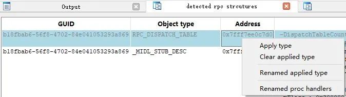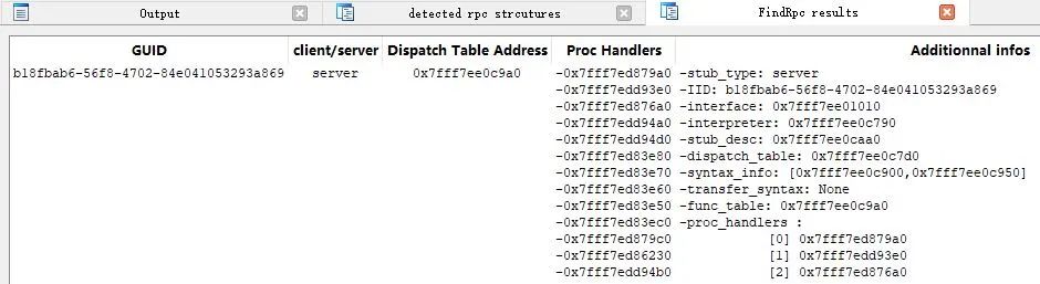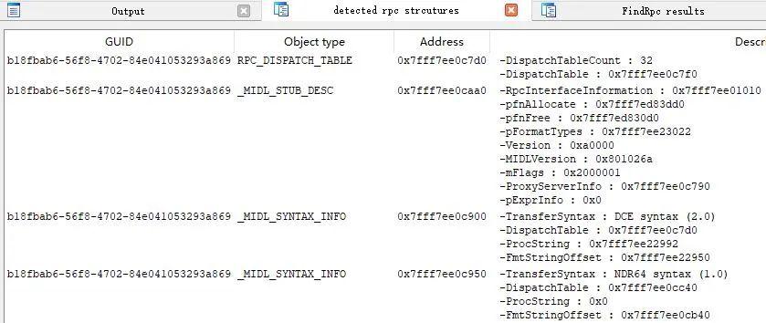 "detected rpc structures"窗口将Output窗口的输出换个形式展现,给出具体结构名及相应地址,比如