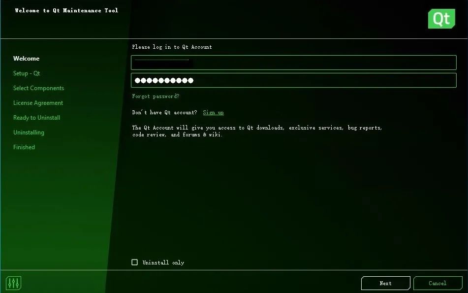 安装到C:\Qt,装完大约2.3GB。在线安装结束后想补充安装或卸载组件,双击执行C:\Qt\MaintenanceTool.exe