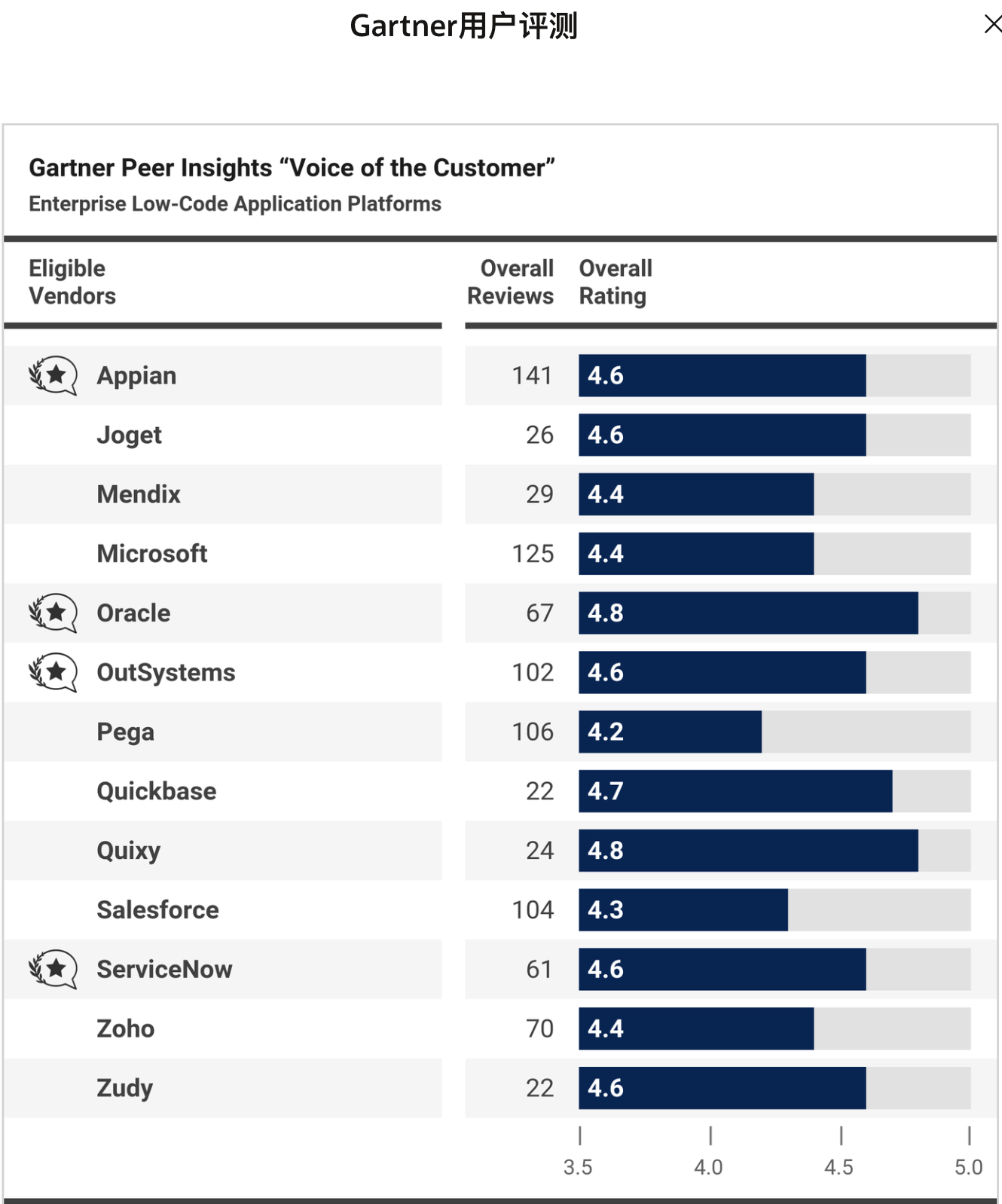 低代码平台全球客户之声排名如下,Gartner评测了成单$50M以上的客户群体,67个客户给予APEX很高的评价。