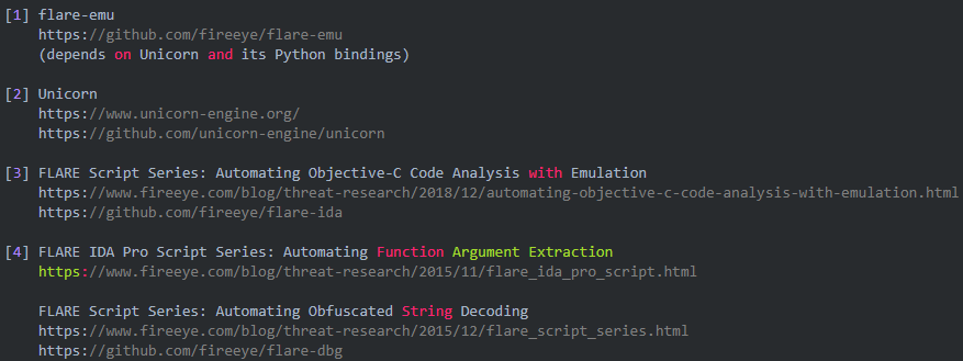 flare-emu的iterate()功能也很实用。举个例子,目标binary中有个私有解码函数对binary中混淆存放的字符串进行解码,iterate()通过分析交叉引用信息自动定位该解码函数的主调位置,根据ABI自动分析、抽取形参,自动调用我们提供的回调函数;回调函数中可以调用解码函数获取反混淆后的明文字符串,在IDA中自动增加注释。这种功能都有重大假设,ABI就是其中之一,当目标binary不满足这些先验假设时,就需要其他Hacking。本文未就iterate()进行示例,相比之下emu_md5_stream.py已把最困难的部分示例清楚了。