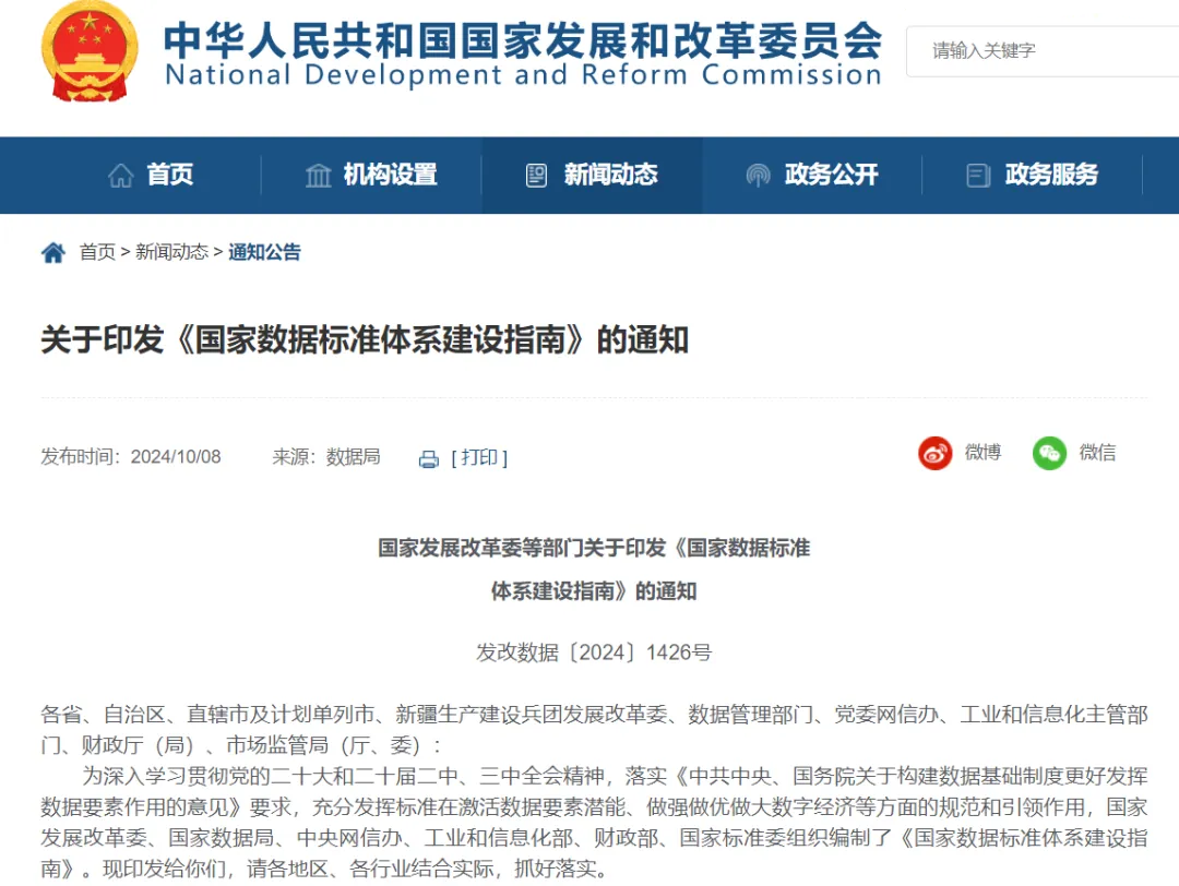 10月8日,国家发展改革委、国家数据局、中央网信办、工业和信息化部、财政部、国家标准委等七部门印发《国家数据标准体系建设指南》。