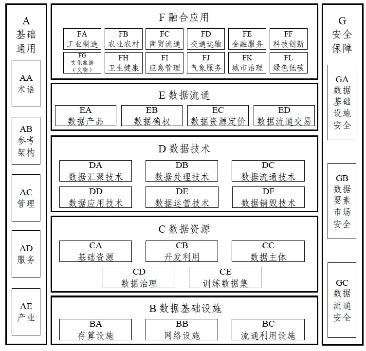 《指南》要求,到2026年底,基本建成国家数据标准体系,围绕数据流通利用基础设施、数据管理、数据服务、训练数据集、公共数据授权运营、数据确权、数据资源定价、企业数据范式交易等方面制修订30项以上数据领域基础通用国家标准,形成一批标准应用示范案例,建成标准验证和应用服务平台,培育一批具备数据管理能力评估、数据评价、数据服务能力评估、公共数据授权运营绩效评估等能力的第三方标准化服务机构。数据标准体系结构图如下
