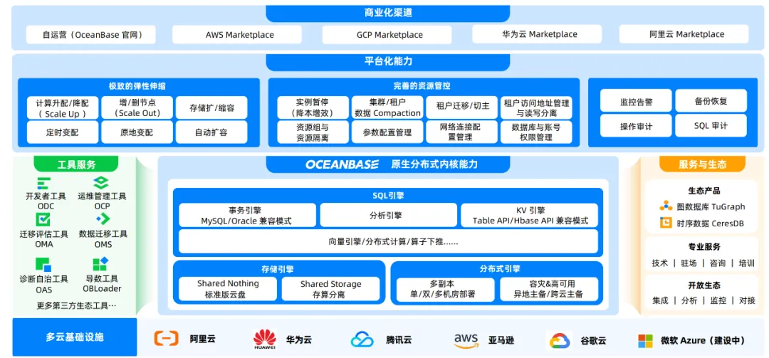 2022 年,OceanBase 正式推出云数据库 OB Cloud,通过一体化云数据库服务助力客户构建现代数据架构,简化技术栈。OceanBase已经形成了较为完善的产品体系。产品体系在云数据库OB Cloud上体现更明显,OB Cloud的理念是通过一体化云数据库,构建现代数据架构,简化技术栈,实现降本增效。