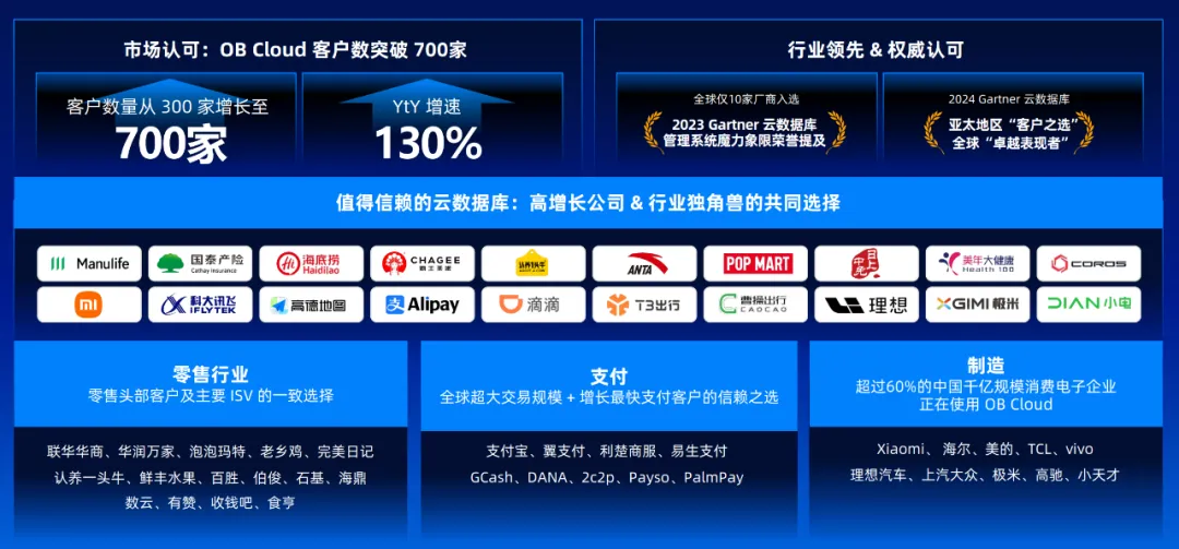 OB Cloud 已覆盖全球 30+ 区域的 100+ 可用区,支持主流公有云基础设施,基于阿里云、华为云、腾讯云、AWS 和 Google Cloud 等提供全球范围内一致体验,满足客户多样的业务增长需求。截至目前,OB Cloud已为超 700 家客户提供服务,客户数量年同比增长130%。2023年OB Cloud获选全球仅10家的Gartner云数据库管理系统魔力象限“荣誉提及”,并在2024年Gartner云数据库客户之声报告中,被评为亚太地区“客户之选”及全球“卓越表现者”。