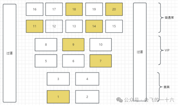 影院座位预定表 T_SEATS 记录了当前座位的预定情况。如有2个人去影院看演唱会,需满足位置紧邻且至少其中一人靠过道(同一排最左或最右的座位靠过道)的座位组合,结果集按开始座位号从小到大排序。座位示意图如下: