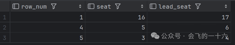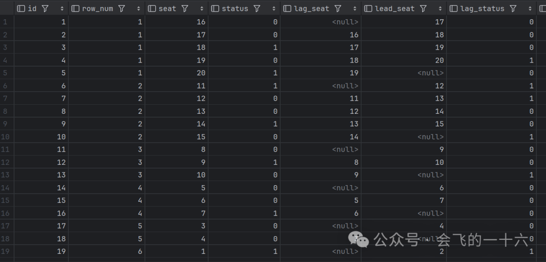 第一步:利用lag()及lead()函数求出左边座位、右边座位,及左边座位状态、右边座位状态,进行辅助判断。