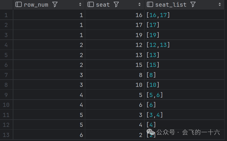select row_num, seat, collect_list(seat)over (partition by row_num order by seat range between current row and 1 following) seat_listfrom t_seatwhere status = 0