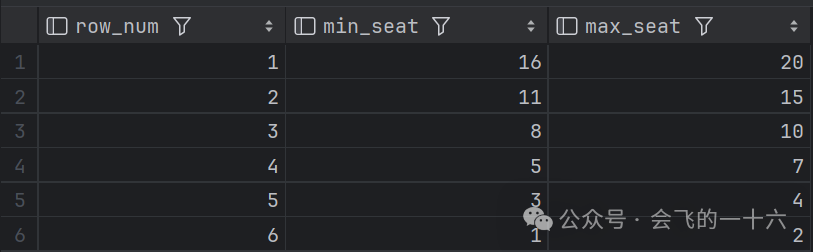 查询结果集,字段顺序及命名如下:开始座位号、结束座位号
