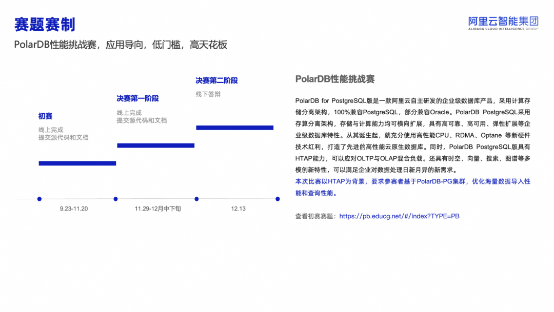 本次比赛以HTAP为背景,要求参赛者基于PolarDB-PG集群,优化海量数据导入性能和查询性能,初赛赛题已经发布(https://pb.educg.net/#/index?TYPE=PB)。