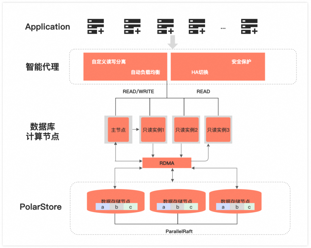 随着数据量的日益增长,运维团队为了确保业务的稳定性,不得不开始考虑数据拆分的问题。由于分库分表带来的兼容性挑战,业务代码也需进行相应修改,这意味着开发团队需要参与架构改造,并重写SQL语句以适应新的分库分表结构。业务团队往往将重点放在业务发展上,在此期间难以抽出精力进行系统的拆分。这导致拆分工作只能不断推迟,直到最终不得不执行。在此期间,整体系统的稳定性始终面临风险。在MySQL生态中,通常建议单表的行数不超过500万行,这一准则背后有其深厚的历史背景。资源方面来说,早期服务器 IO 能力比较低,单表过大会增加 B-tree 索引的高度,进而导致 IO 问题。同时磁盘容量也比较低,要考虑存储上限以及备份空间的问题。从运维层面来说,旧版本MySQL(5.5以前)基本不支持在线DDL,在对大表进行维护时,可能会导致业务异常。阿里云瑶池旗下的云原生数据库PolarDB采用共享分布式存储架构,与传统MySQL数据库相比,提供了显著更强的大表处理能力。许多传统的分库分表场景变得不再必要。目前,PolarDB公共云已有大量用户的单表数据超过10 TB或10亿行。分库分表相较于单表会带来极大的复杂性提升,因此,在非必要的情况下,不应过早进行过度优化。很多业务在快速发展阶段,开始考虑数据拆分的原因其实并不是计算能力遇到了瓶颈,而是海量数据的存储到达了单实例上限,但是由于最初设计的时候没有考虑到海量数据的使用方式,或是在业务逻辑中,数据无法进行清理或归档。PolarDB采用了计算存储分离和共享分布式存储架构。相比于传统针对单机系统设计的MySQL,分布式的存储设计让 PolarDB 的实例目前最多支持 1 PB 的存储空间,PolarDB的存储是由一组Chunk Server通过 RDMA 硬件连接在一起(PFS技术), 对上层提供块设备接口,而计算节点通过RDMA网络将存储挂载到计算节点中,从上往下看,底层的Chunk对于计算是完全透明的。近乎海量的存储空间,用户不用苦恼于磁盘容量限制和扩缩容问题,只需专注于业务的需求设计,并且不用进行分库分表的数据拆分,极大减轻了业务系统的复杂程度。