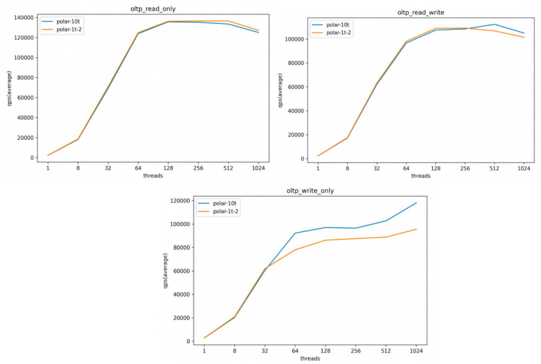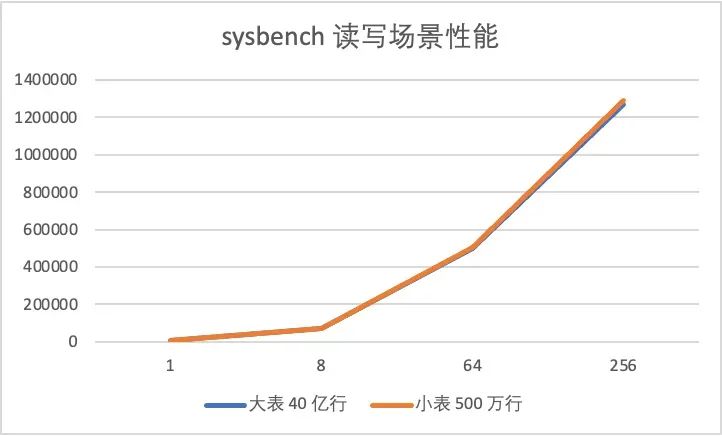 我们分别用 sysbench 插入 400 亿行数据(10 TB),作为对照,PolarDB还插入了 40 亿行数据(1 TB)、500 万行数据(125 GB)。整体上看,单大表的性能和单小表的性能在高并发场景下基本趋近,此外,真实生产环境中不会像压测场景下出现如此密集的写入导致脏页维持在非常高的水位,完全可以承载一般业务流量。