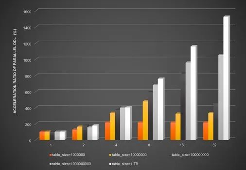 传统的DDL操作基于单核和传统硬盘设计,导致针对大表的DDL操作耗时较久,延迟过高。以创建二级索引为例,过高延迟的 DDL 操作会阻塞后续依赖新索引的DML查询操作。多核处理器的发展为并行DDL使用更多线程数提供了硬件支持,而固态硬盘(Solid State Disk,简称SSD)的普及使得随机访问延迟与顺序访问延迟相近,使用并行DDL加速大表的索引创建显得尤为重要。PolarDB的并行DDL功能,能够充分发挥数据库硬件资源,大幅降低DDL的执行耗时,避免阻塞后续相关的DML操作,缩短执行DDL操作的窗口期。并行DDL上线以来,已经实际帮助大量客户解决了大表添加索引的痛点问题。根据真实用户反馈,启用并行DDL功能后,对于一张5 TB、60亿行的大表,仅需1小时即可完成二级索引的添加。下图展示了当使用不同的并行线程数时, 在不同数据量的表中开启并行DDL后,在数据类型为INT的字段b上创建二级索引带来的DDL执行效率的提升比例。可以看到,当开启32线程时,最高可获得2000%的性能提升。不同的并行线程数对DDL的性能提升对比图