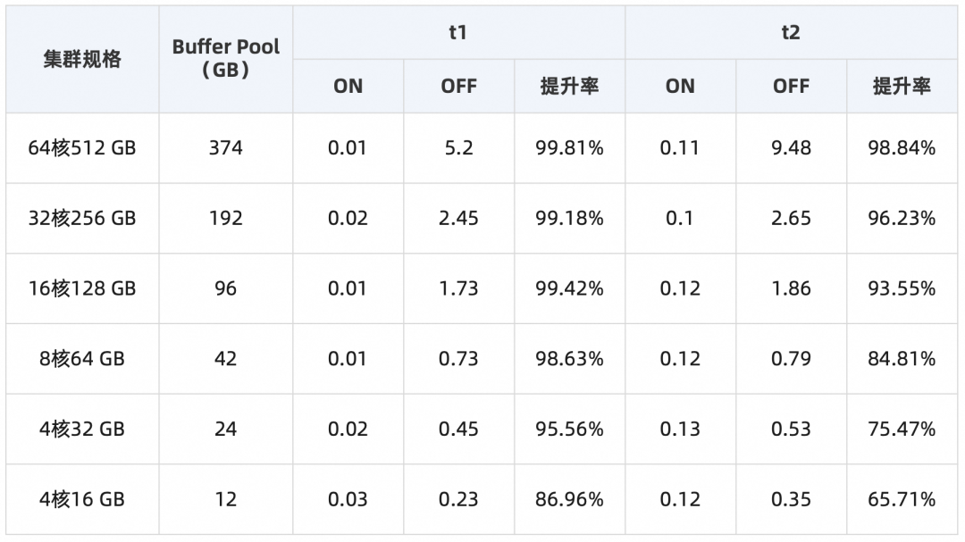 ▶︎ 2.3.4 SAAS刚需:快速Truncate/Drop大表在社区MySQL 5.7中,当执行TRUNCATE TABLE和DROP TABLE时,需要扫描整个缓存池(Buffer Pool),将表空间对应的所有数据页从LRU list和FLUSH list中删除。当Buffer Pool比较大时,该操作耗时较长。PolarDB对DDL过程中的Buffer Pool管理机制进行了优化,能够有效提升Buffer Pool的扫描效率,提升TRUNCATE TABLE和DROP TABLE的执行效率。参数 loose_innodb_flush_pages_using_space_id 设置为 ON 即可启用此功能使用效果