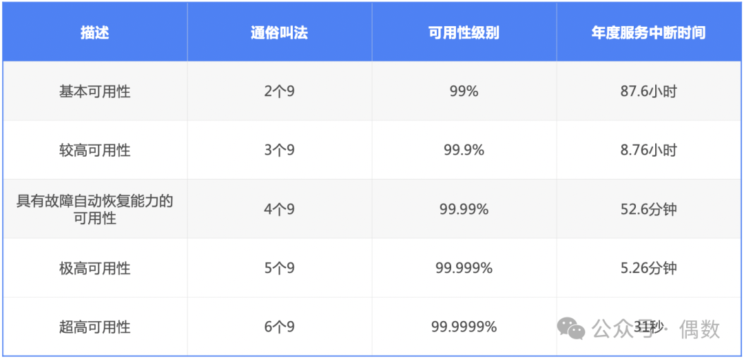 “9”越多代表分布式架构高可用能力越强,一年内中断服务的时间越短,比如99代表基本可用,999代表较高可用。