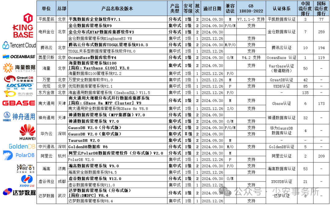 本次测评,共有6款集中式数据库和11款分布式数据库产品通过评审。2023年12月,第一份数据库产品测评,共有11款集中式数据库产品通过评审。合并统计两次评审结果数据,具体如下表所示。