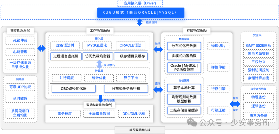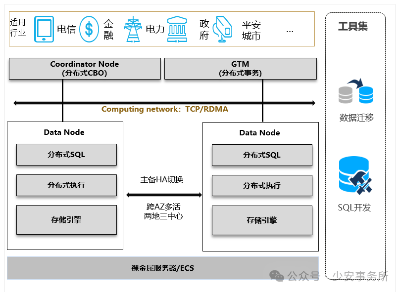 中兴GoldenDB是自主研发的分布式数据库系统,整体由计算节点、数据节点、全局事务管理器、管理节点四种核心模块组成,外围包含导入导出模块,以及相关的备份、恢复等运维工具。整个系统采用高可靠性设计无单点故障,计算节点为无状态多节点部署,数据集群内由多个安全分片组构成,每个安全分片组内数据节点主备多机部署,全局事务管理器主备多机部署。支持多集群及动态扩容,每个集群由多个安全分片组组成,每个安全分片组内部包含主备复制关系的数据库节点,可动态对集群内的安全分片组数量进行扩容以及动态增加集群的数量。通过全局事务管理器支持多节点的分布式事务,保证数据一致性。兼容SQL92、SQL99、SQL2003标准语法,完全兼容MySQL语法,兼容常用Oracle、DB2语法。GoldenDB 成功通过金融、运营商行业现网多年严苛考验,服务超百家重点行业用户,引领各行业核心业务数据库分布式架构转型;在行业主管部门的指导下引领标准制定,与行业伙伴共建新生态。