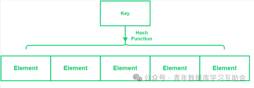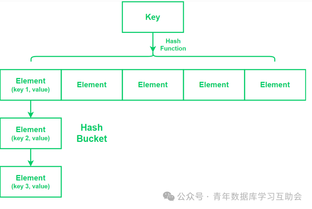 而为了处理“元素碰撞”(即因为哈希函数乃至于哈希表容量,使得多个数据键对应到同一个数据存储位置)的问题,一般我们会设立“哈系桶”,如图所示: