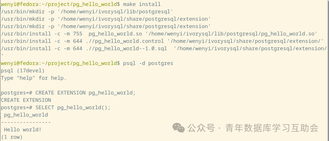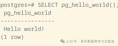 CREATE EXTENSION pg_hello_world;SELECT pg_hello_world();