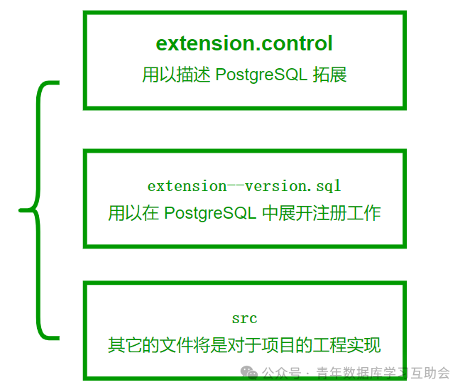 一般而言,PostgreSQL 拓展都会整合为一个单独的文件夹(并且通过 git 工具进行源代码管理),它们都需要回答如下的三个问题:
