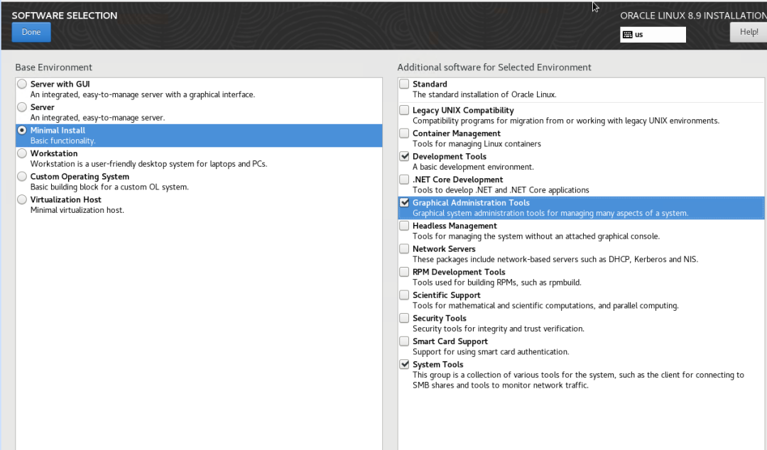 系统安装的时候,选择最小安装,勾选了一些常用的工具和开发包。