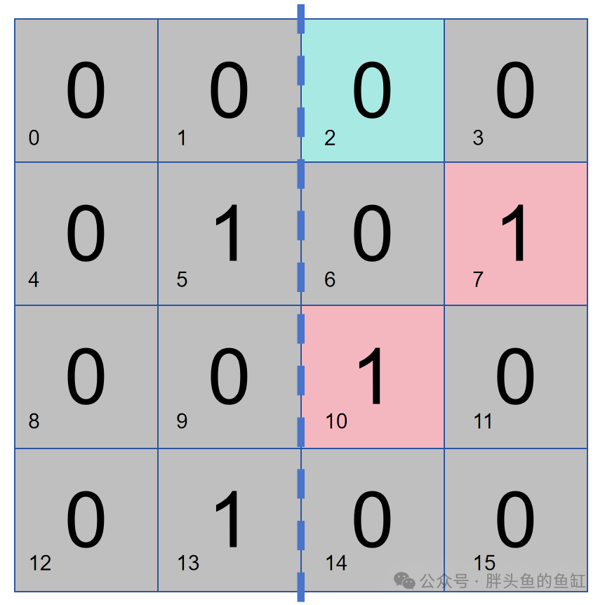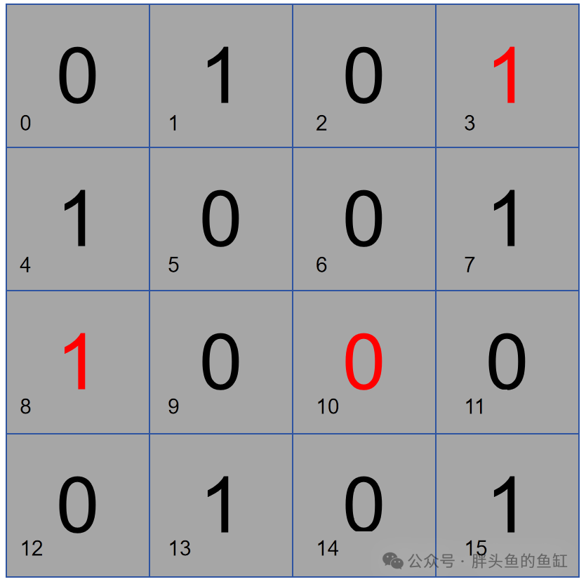 这里循序渐进一下,把一个16bit的数据按照下面的方式排布,假设2号位负责对右边部分进行奇偶校验,那么这份数据两个1,则2号位为0。如果数据出现错误,奇偶校验判定右半区没有问题,那么问题就在左半区了,反之问题就在右边。