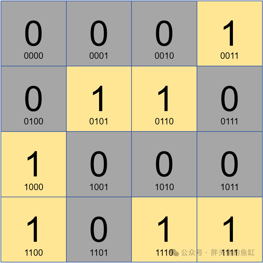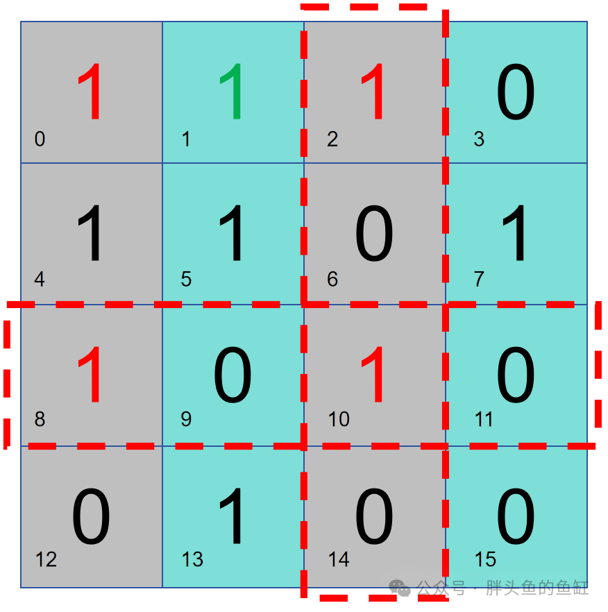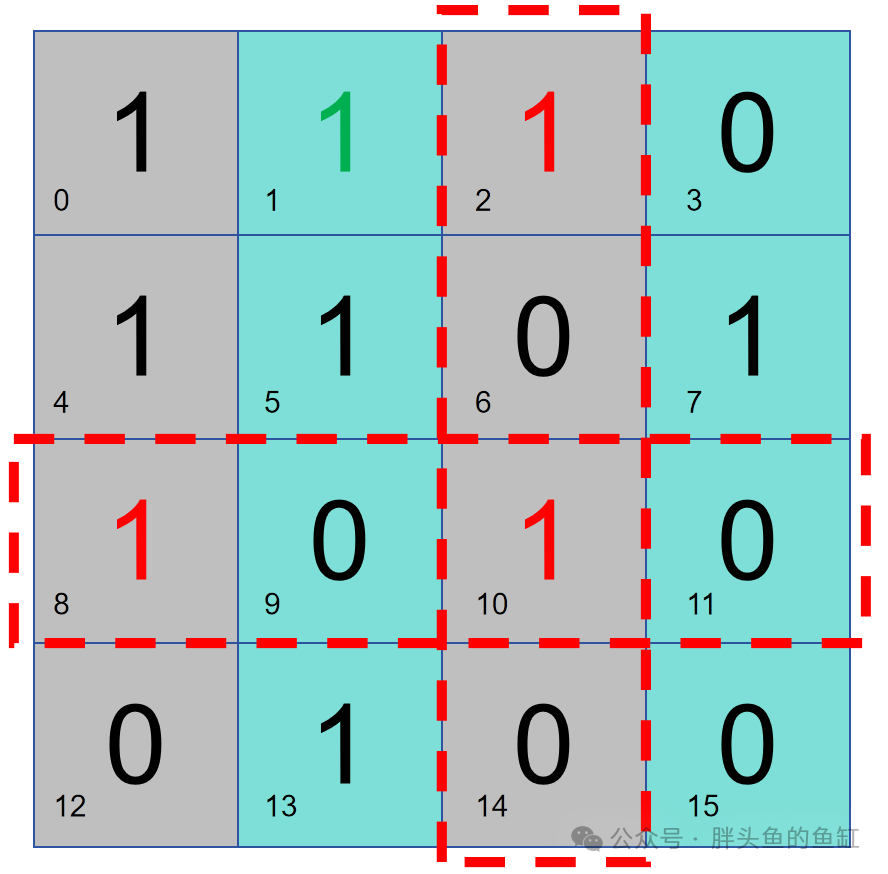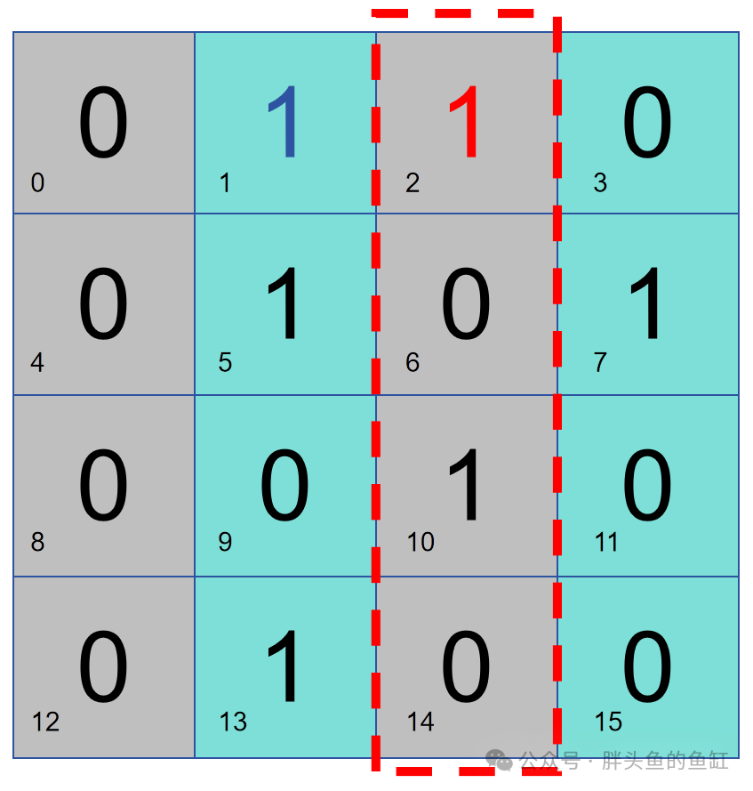 如下图,1号位对2、4列进行奇偶校验,那么1号位存储则为1。如果2、4列奇偶校验出现问题,那么问题就在2、4列,反之是1、3列出现问题。