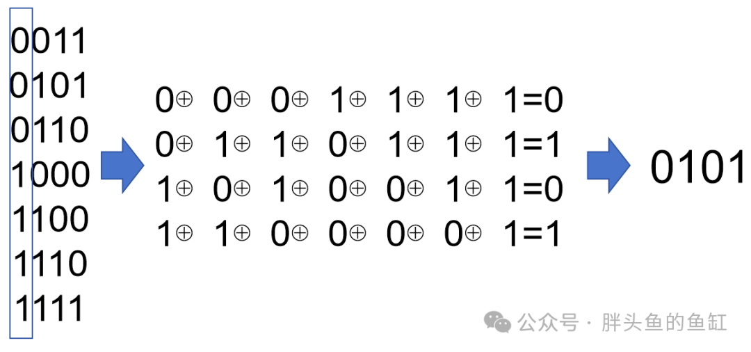 我们将所有为1的位置拿出来,做个竖向二进制抑或运算,就可以直接得出有问题的位置: