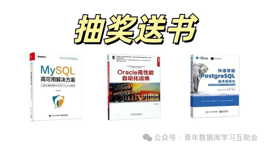 奖品为包邮实体书籍:《MySQL高可用解决方案——从主从复制到InnoDB Cluster架构》、《Oracle高性能自动化运维》、《快速掌握PostgreSQL版本新特性》