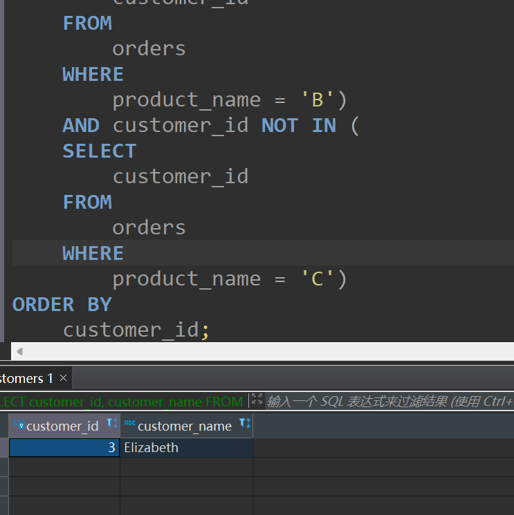 第一个查询使用了子查询和IN操作符来筛选同时购买了产品A和B但没有购买产品C的顾客。这个查询的优点是它可以非常直接地利用索引(如果customer_id和product_name上有索引的话),因为它是在较小的结果集上独立地进行过滤。此外,数据库优化器可能能够更有效地处理这种类型的查询,因为它不需要对整个订单表进行分组和聚合操作。