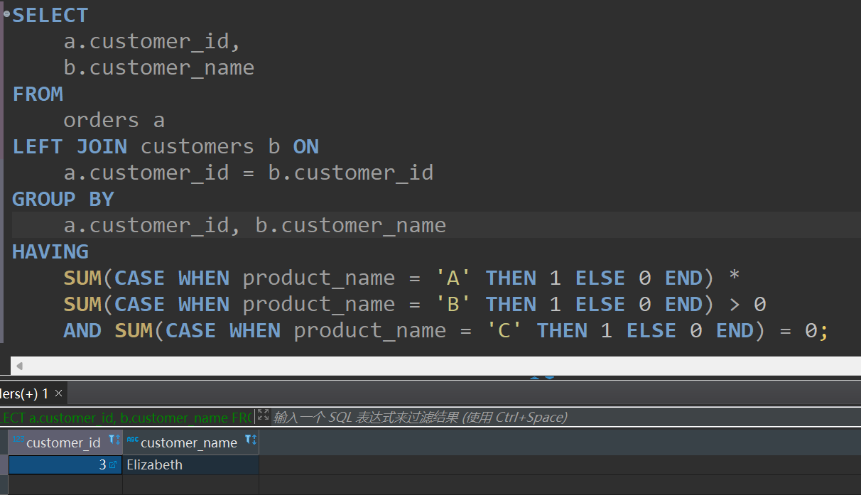 第二个查询使用了LEFT JOIN来连接customers和orders表,并通过GROUP BY和HAVING子句来过滤结果。这个查询的优点是它在单个查询中完成了所有工作,但缺点也很明显: