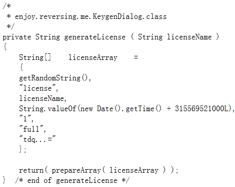 License和ActivationResponse中用两个常量冒充RSA签名,修改compareTo(),一旦发现在检查这两个c的pow(c,e,n)值,就返回0,表示相等。至于compareTo()中用equals()还是startsWith(),无关紧要,随便。某种意义相对于替换了两组n。