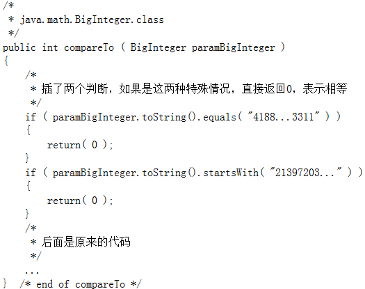 为了让几次签名校验得以通过,作者修改了java.math.BigInteger.compareTo():