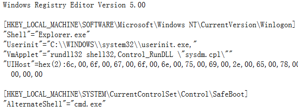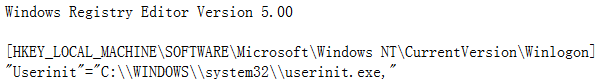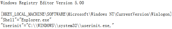 winlogon.exe根据Userinit键值数据定位userinit.exe并启动之。Userinit键值数据可以包含多项内容,用逗号分隔开;winlogon.exe会依次尝试启动它们,如果第一个启动失败则尝试第二个,如果有一个成功则本过程结束,如果都失败则强制logoff。