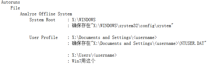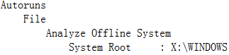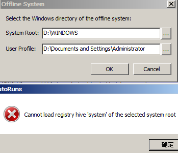 "离线注册表编辑"与Autoruns的"Analyze Offline System"是冲突的,只能二选一,不能同时使用。比如已经进入"离线注册表编辑",此时使用Autoruns的"Analyze Offline System",输入"System Root"后会提示: