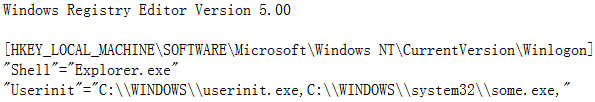 幺蛾子出在Userinit键值,非正常设置。不存在"C:\WINDOWS\userinit.exe",此时winlogon.exe尝试启动"C:\WINDOWS\system32\some.exe",而some.exe并不会自动启动explorer.exe。