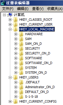 Windows的注册表并不是想象中的存储在一个大文件里,而是分散存储在一组被称为HIVE的文件中。参看如下注册表项,这是XP中的示例: