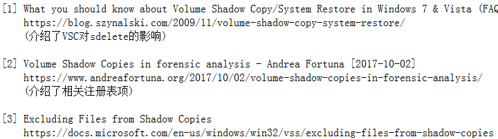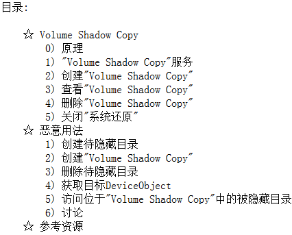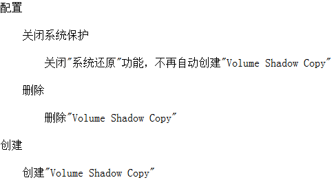 VSC本来是个正经功能,但像前文所述的恶意用法在各种攻击事件中很常见。如果有所怀疑,如何快速找出位于"Volume Shadow Copy"中的hidedir?这是个开放式提问。如果不能找出位于"Volume Shadow Copy"中的hidedir,可以直接删除所有"Volume Shadow Copy"、关闭"系统还原"等等,但不是所有场景都允许你这么干。总之,VSC是个坑。