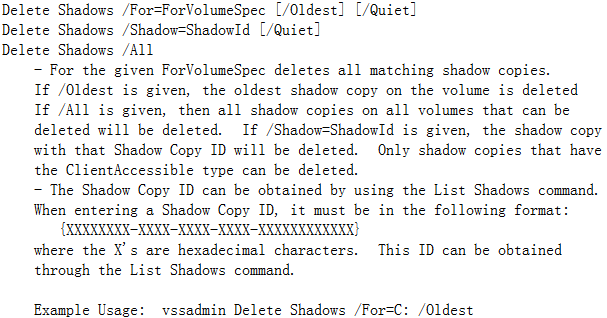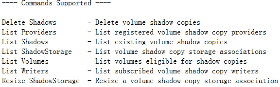 现在的Windows自带vssadmin.exe,一般来说至少支持如下子命令:
