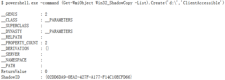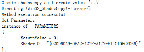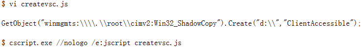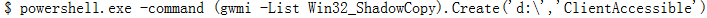 $ rundll32.exe javascript:"\..\mshtml,RunHTMLApplication ";GetObject("winmgmts:\\\\.\\root\\cimv2:Win32_ShadowCopy").Create("d:\\","ClientAccessible")