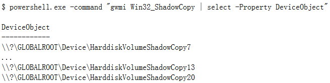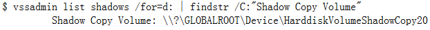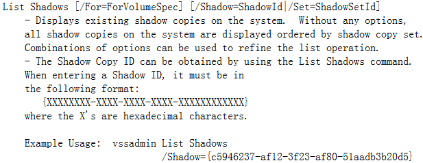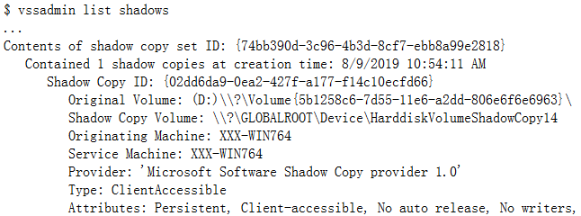 $ vssadmin list shadows /shadow={02dd6da9-0ea2-427f-a177-f14c10ecfd66}