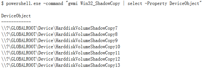 如下命令会显示系统中所有"Volume Shadow Copy",最后一个就是新创建的。
