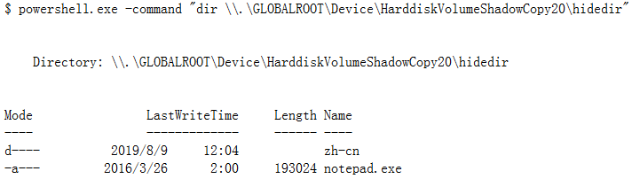 $ powershell.exe -command '\\.\GLOBALROOT\Device\HarddiskVolumeShadowCopy20\hidedir\notepad.exe'