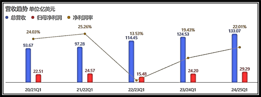 第一季度 GAAP(Generally Accepted Accounting Principles,简称GAAP,指按照一般公认会计原则) 营业收入为 40 亿美元。非 GAAP 营业收入为 57 亿美元,增长 13%。 GAAP 营业利润率为 30%,非 GAAP 营业利润率为 43%。GAAP 净收入为 29 亿美元。非 GAAP 净收入为 40 亿美元,增长 18%。 第一季度 GAAP 每股收益为 1.03 美元,以美元计算增长 20%,按固定汇率计算增长 22%,而非 GAAP 每股收益为 1.39 美元,增长 17%。 短期递延收入(钱给了,活没干完呢)为 115 亿美元。强劲的合同积压(合同签了,但用户还没有付完款)将增加整个 25 财年的收入增长。RPO (剩余履约价值,包括递延收入、合同积压在内)比去年增长了 53%,达到创纪录的 990 亿美元。 在过去 12 个月中,经营现金流为 191 亿美元,自由现金流为 113 亿美元。