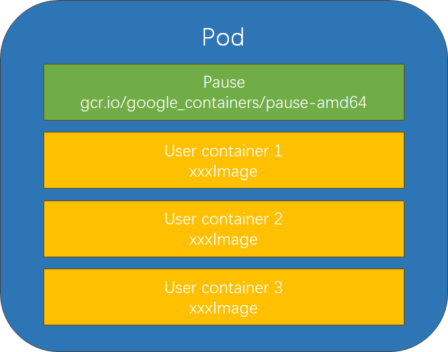 每个 Pod 中运行着 1 个 Pause “根容器”及 N 个业务容器,这些业务容器共享 Pause 容器的网络栈和 Volume 挂载卷。