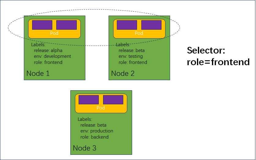 如下图所示,Label Selector 为 role=frontend 对应到 Node 1 和 Node 2 上面的 Pod。