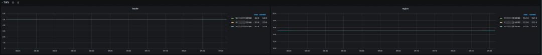 从 Grafana 中查看 Region 及 Leader 的分布情况,可以发现 3 个节点上的 leader 和 region 副本个数完全均衡。由于此时所有节点均未设置标签且未设置任何 Placement Rules 策略,根据 PD 自动调度均衡的原则,符合预期。