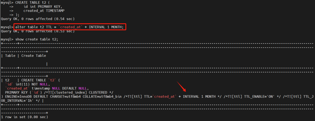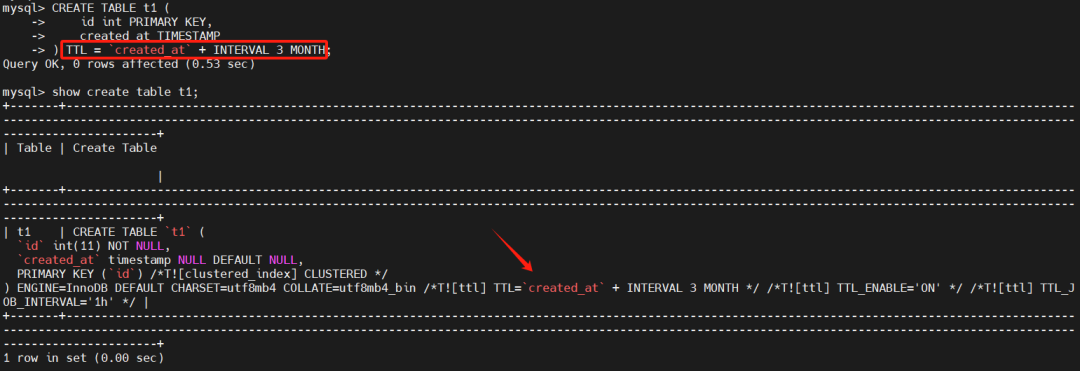 从以上两个示例的表结构输出中,我们看到除了TTL属性外,还额外显示了两个属性 TTL_ENABLE 和TTL_JOB_INTERVAL。TTL_ENABLE 表示是否启用 TTL 任务,默认值为 ON,如果把 TTL_ENABLE 设置为 OFF,即使表上有 TTL 选项,也不会自动清理过期数据。TTL_JOB_INTERVAL 表示清理过期数据任务的调度周期,默认为 1h,如果想调整过期数据的清理周期,可以使用 ALTER TABLE 来修改此属性。