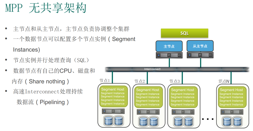 Greenplum是一款非常优秀的MPP数据库,采用Shared-Nothing架构,可以管理和处理分布在多个不同主机上的大规模数据集。对于Greenplum数据库来说,一个集群是由多个独立的PostgreSQL实例构成的,它们分布在不同的主机上,实例之间协同工作,用户可以像使用一个普通的单机数据库进行访问和执行SQL操作。Master是整个系统的访问入口,负责处理客户端的连接和SQL命令、协调系统中其他实例协同工作,计算实例负责管理和处理具体的业务数据,并将处理结果反馈给Master。