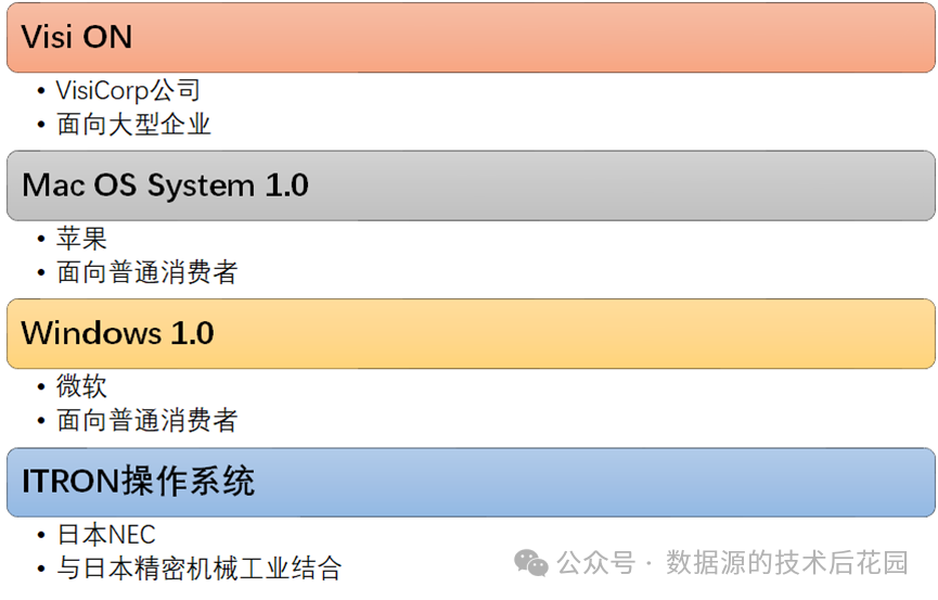 1984年以前,所有操作系统都是基于企业或高校来设计和使用,还未普及,且大部分计算机系统都是基于命令行终端,没有图形化操作界面。1984年前后,操作系统发生了以下几个变化: