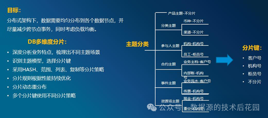 4) 合约主题,业务主档按客户号进行HASH 或者 RANGE 分片。机构按照机构编号进行RANGE 分片。